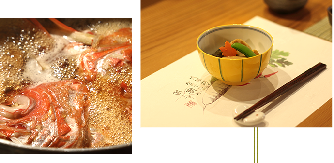 長年付き合いのある魚屋さんから、焼津の漁港で水揚げされた鮮魚を仕入れています。旬の味覚を大切にする当店では、初冬の高級魚アカヤガラなどの珍しい魚やとっておきの海鮮料理に出合えることもしばしば。その他にも、藤枝で育てられた野菜など、地元ならではの美味しさを盛り込んだ一皿を皆様にお届けします。