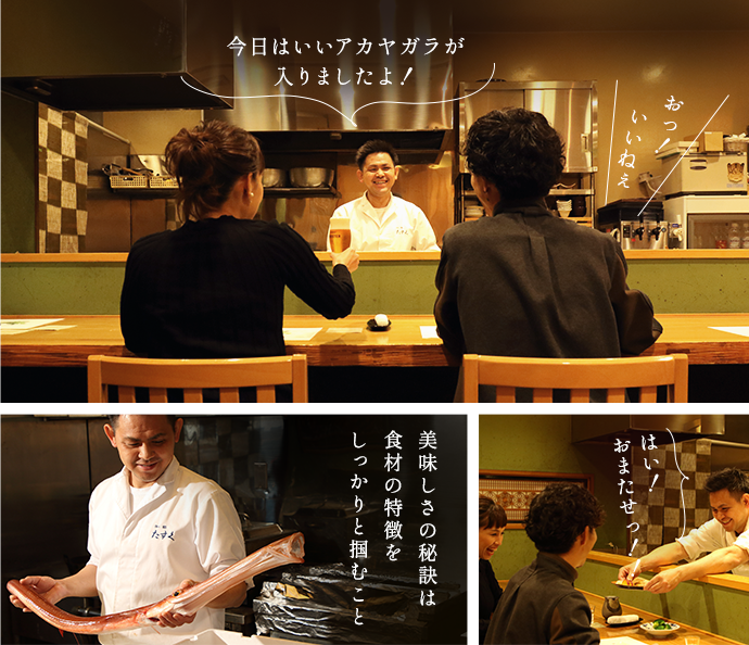 当店では、会話を通してその日の仕入れ状況やお客様の気分に合わせた一品と日本酒をご提案します。お酒は、初亀や喜久酔、志太泉など、藤枝や焼津の地酒をはじめ全国各地の日本酒を常時25種類以上取り揃えています。その銘柄は、料理を引き立てる味わいのものが中心で、日本酒好きの方にも喜んでもらえるラインナップが魅力です。